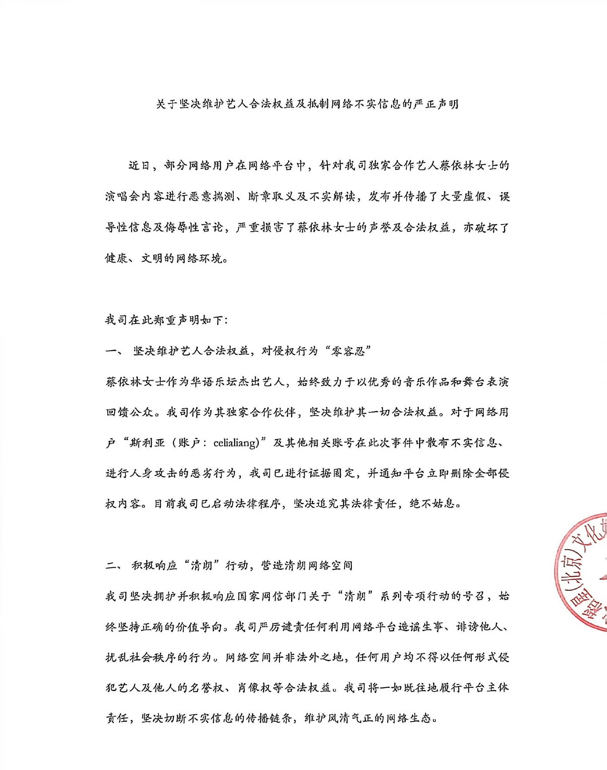 博主"斯利亚"等账号煽动网友向西安、广西等地文旅局提交数百封举报信,要求取消未举办场次。2026年1月7日,蔡依林经纪公司发布严正声明,点名"斯利亚"等账号散布伪造图片(如"蔡依林被蛇缠哭")及不实信息,已固定证据并启动法律程序。